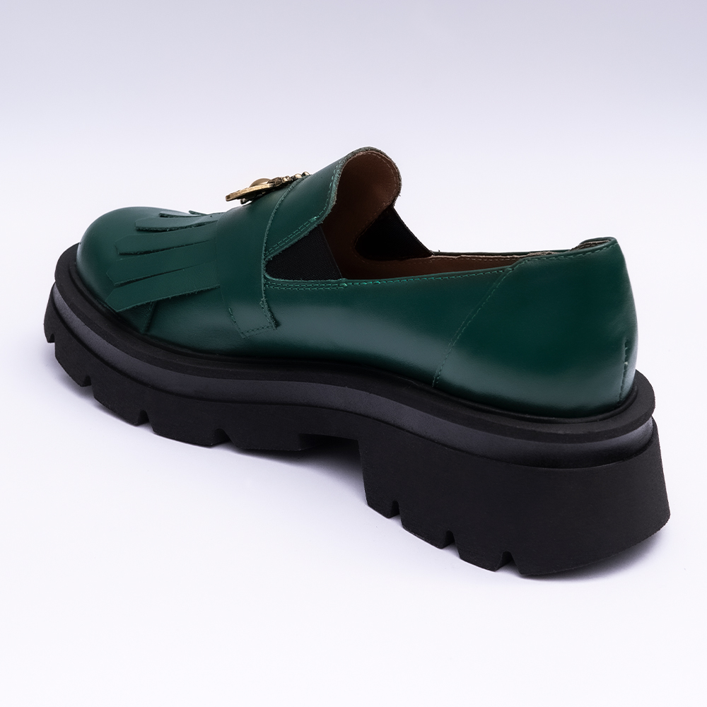 Adaugă o notă de prospețime și rafinament garderobei tale cu acești loafers din piele naturală, într-o nuanță rară și sofisticată de verde smarald metalizat. Realizați manual în România, acești pantofi combină măiestria tradițională cu designul modern „chunky”, fiind alegerea ideală pentru femeia care privește moda ca pe o formă de expresie personală.